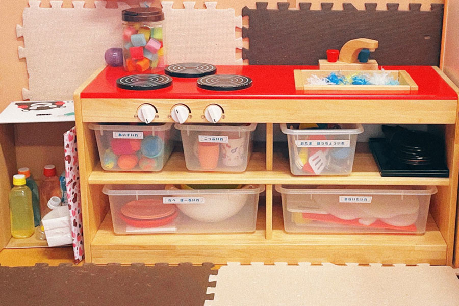 何がどこにあるかも見やすく配置しておくことで、子どもが思いついたときに自分で必要なものを取り出し、さらにそれらの素材で創意工夫してあそびを発展させていく姿もみられます。 -