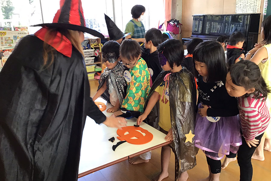 当園では月に2回、4・5歳児が対象に、英語講師を招いて”あそびながら楽しく学べる英会話”の時間を設けています。